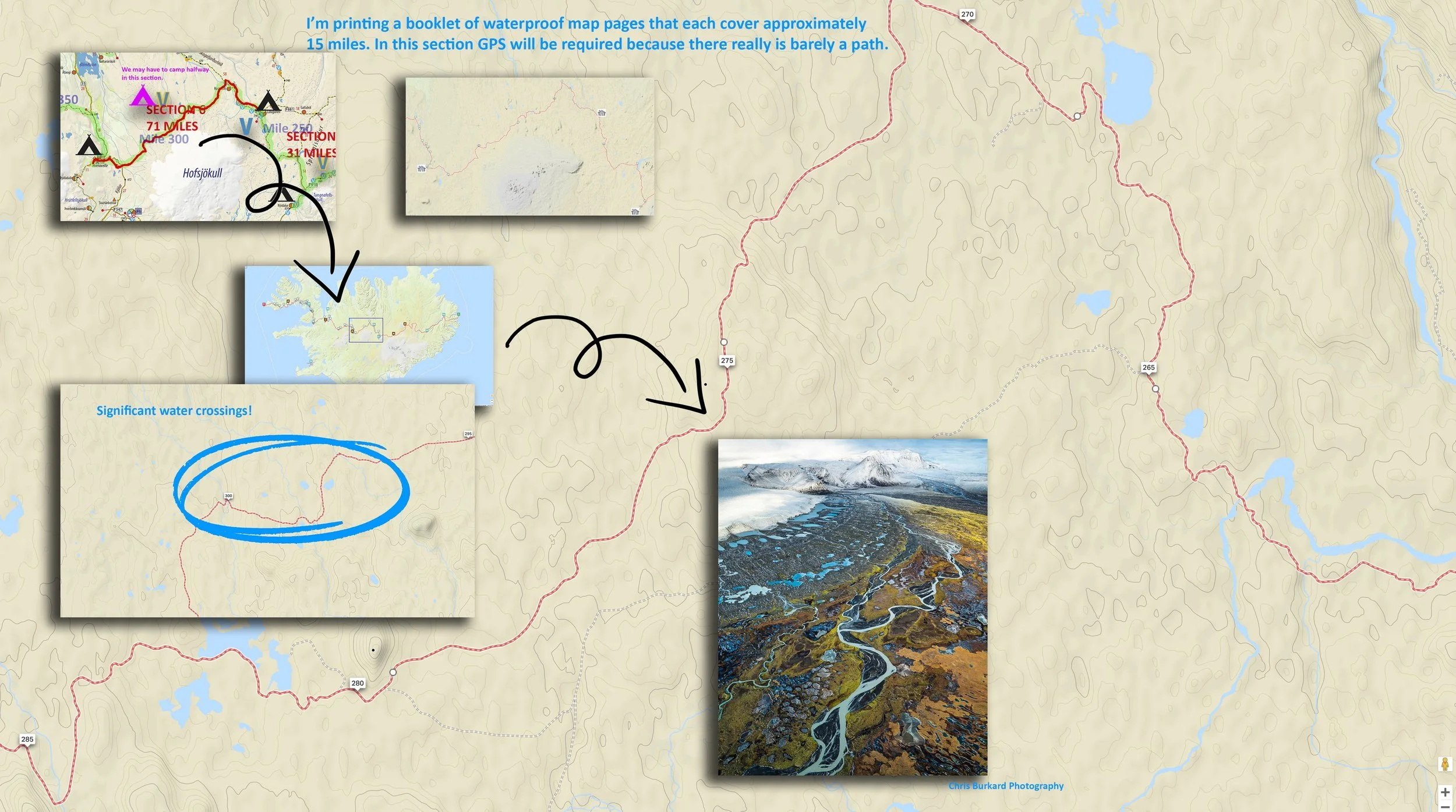 Hofsjökull glacier is going to make for over 25 river crossings. Luckily, right now anyway, the forecast is for below average flow from melt. This is the section I’m most excited about and the section I’m most concerned about. Waist deep water will sweep you away, and in water just above freezing it won’t take long to get hyperthermic.